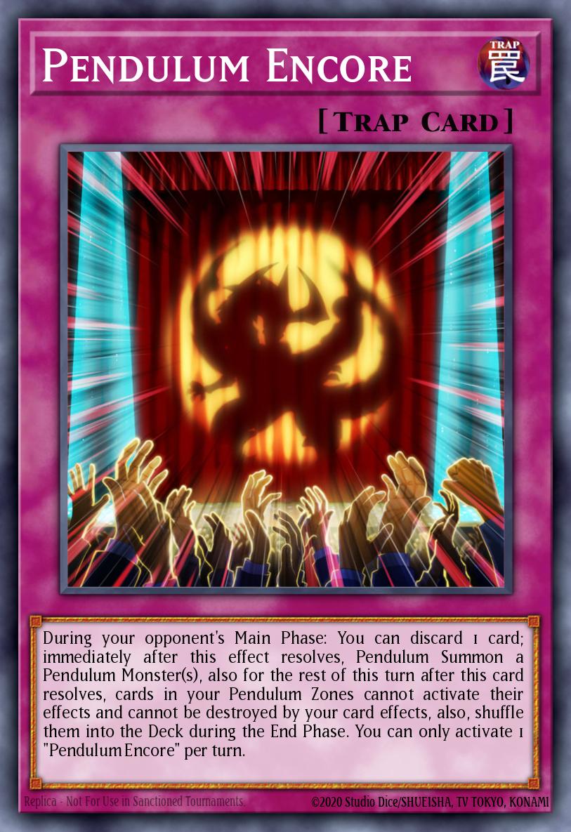 During your opponent's Main Phase: You can discard 1 card; immediately after this effect resolves, Pendulum Summon a Pendulum Monster(s), also for the rest of this turn after this card resolves, cards in your Pendulum Zones cannot activate their effects and cannot be destroyed by your card effects, also, shuffle them into the Deck during the End Phase. You can only activate 1 "Pendulum Encore" per turn.