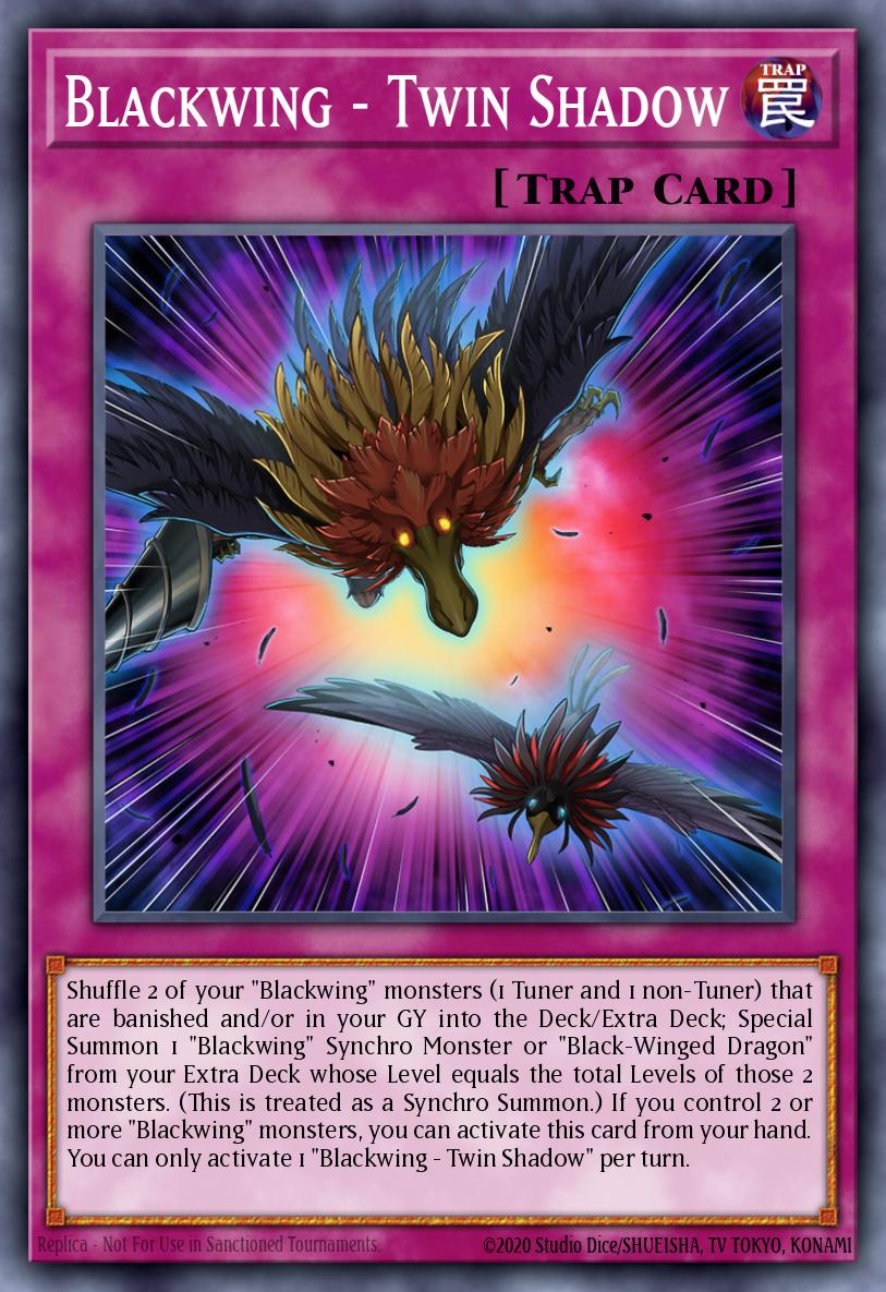 Shuffle 2 of your "Blackwing" monsters (1 Tuner and 1 non-Tuner) that are banished and/or in your GY into the Deck/Extra Deck; Special Summon 1 "Blackwing" Synchro Monster or "Black-Winged Dragon" from your Extra Deck whose Level equals the total Levels of those 2 monsters. (This is treated as a Synchro Summon.) If you control 2 or more "Blackwing" monsters, you can activate this card from your hand. You can only activate 1 "Blackwing - Twin Shadow" per turn.