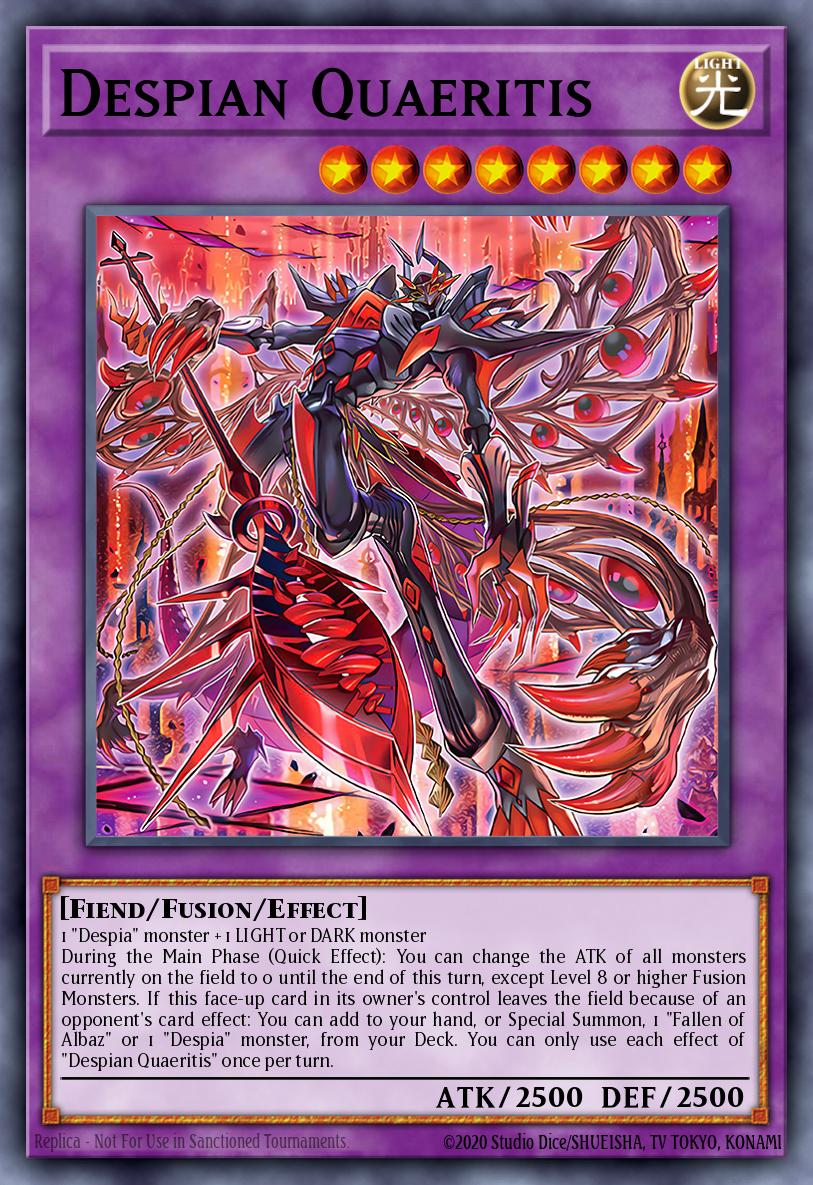 1 "Despia" monster + 1 LIGHT or DARK monster During the Main Phase (Quick Effect): You can change the ATK of all monsters currently on the field to 0 until the end of this turn, except Level 8 or higher Fusion Monsters. If this face-up card in its owner's control leaves the field because of an opponent's card effect: You can add to your hand, or Special Summon, 1 "Fallen of Albaz" or 1 "Despia" monster, from your Deck. You can only use each effect of "Despian Quaeritis" once per turn.