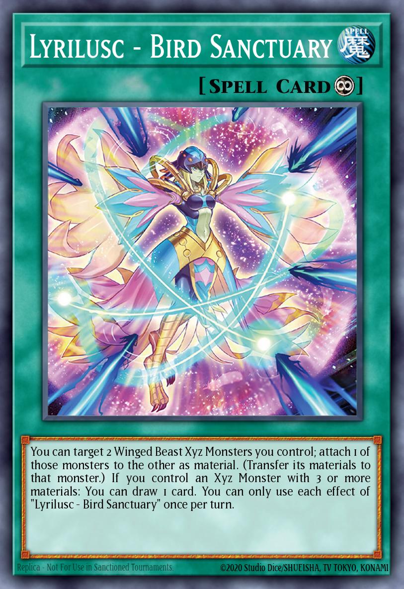 You can target 2 Winged Beast Xyz Monsters you control; attach 1 of those monsters to the other as material. (Transfer its materials to that monster.) If you control an Xyz Monster with 3 or more materials: You can draw 1 card. You can only use each effect of "Lyrilusc - Bird Sanctuary" once per turn.