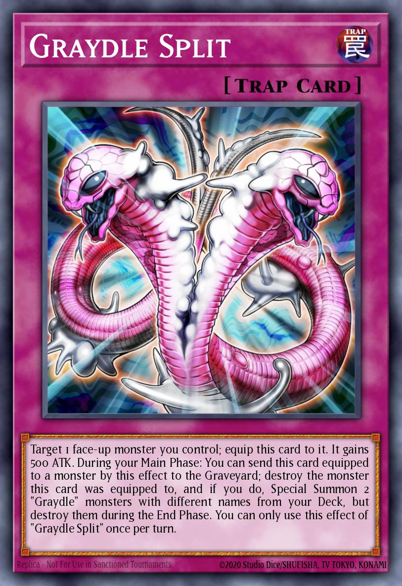 Target 1 face-up monster you control; equip this card to it. It gains 500 ATK. During your Main Phase: You can send this card equipped to a monster by this effect to the Graveyard; destroy the monster this card was equipped to, and if you do, Special Summon 2 "Graydle" monsters with different names from your Deck, but destroy them during the End Phase. You can only use this effect of "Graydle Split" once per turn.