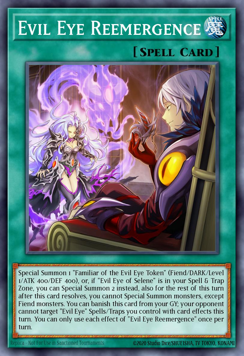 Special Summon 1 "Familiar of the Evil Eye Token" (Fiend/DARK/Level 1/ATK 400/DEF 400), or, if "Evil Eye of Selene" is in your Spell & Trap Zone, you can Special Summon 2 instead, also for the rest of this turn after this card resolves, you cannot Special Summon monsters, except Fiend monsters. You can banish this card from your GY; your opponent cannot target "Evil Eye" Spells/Traps you control with card effects this turn. You can only use each effect of "Evil Eye Reemergence" once per turn.
