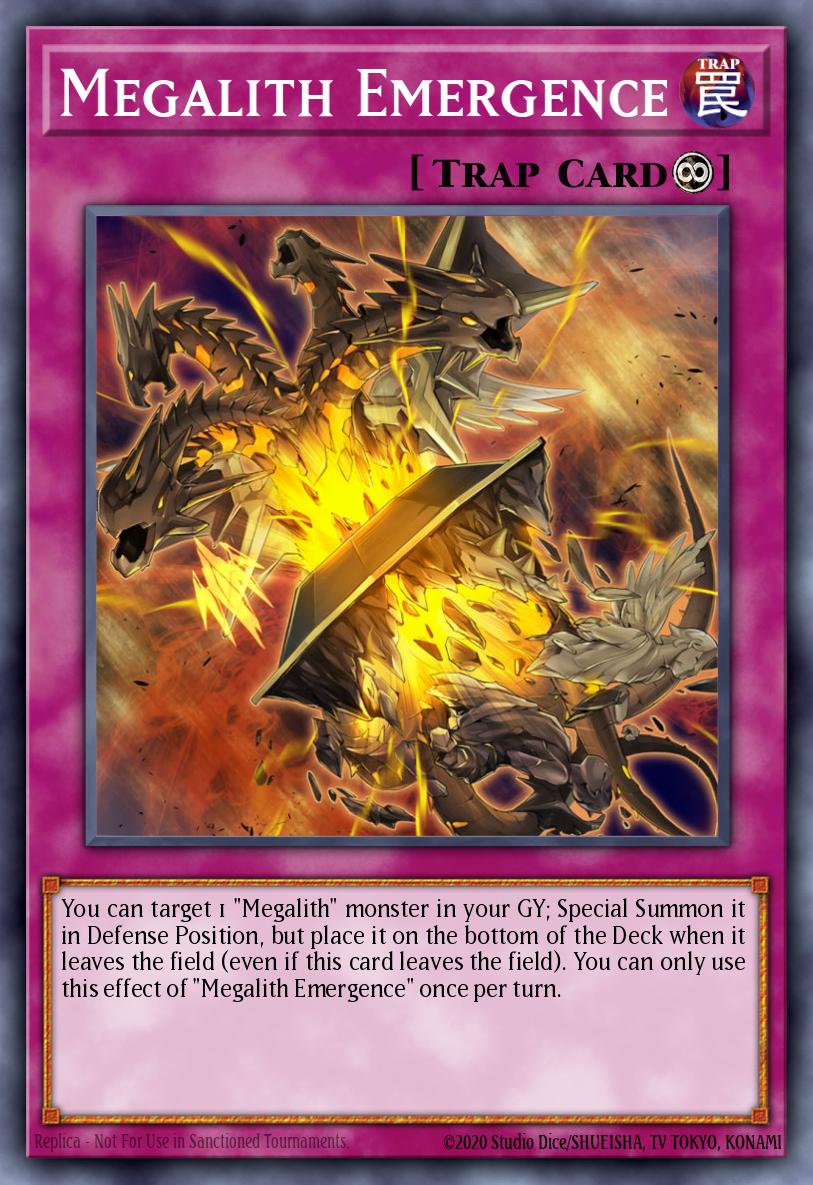 You can target 1 "Megalith" monster in your GY; Special Summon it in Defense Position, but place it on the bottom of the Deck when it leaves the field (even if this card leaves the field). You can only use this effect of "Megalith Emergence" once per turn.