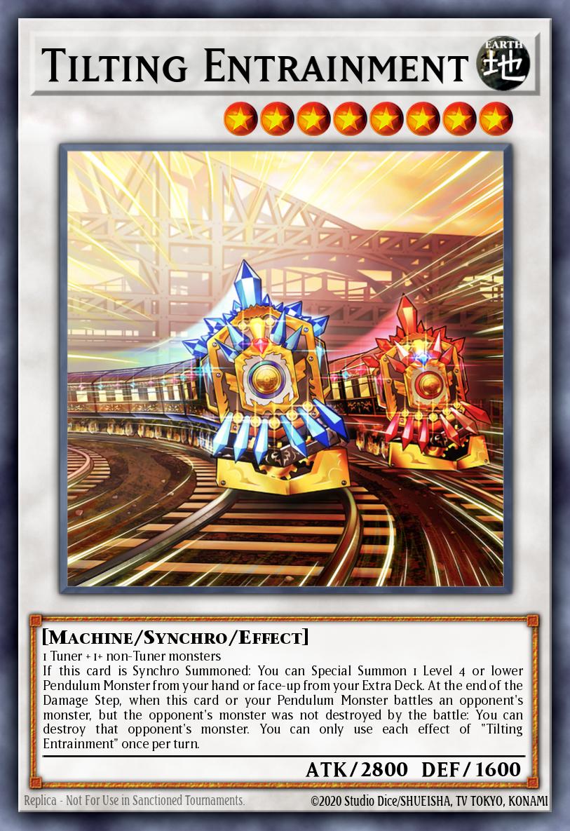 1 Tuner + 1+ non-Tuner monsters If this card is Synchro Summoned: You can Special Summon 1 Level 4 or lower Pendulum Monster from your hand or face-up from your Extra Deck. At the end of the Damage Step, when this card or your Pendulum Monster battles an opponent's monster, but the opponent's monster was not destroyed by the battle: You can destroy that opponent's monster. You can only use each effect of "Tilting Entrainment" once per turn.