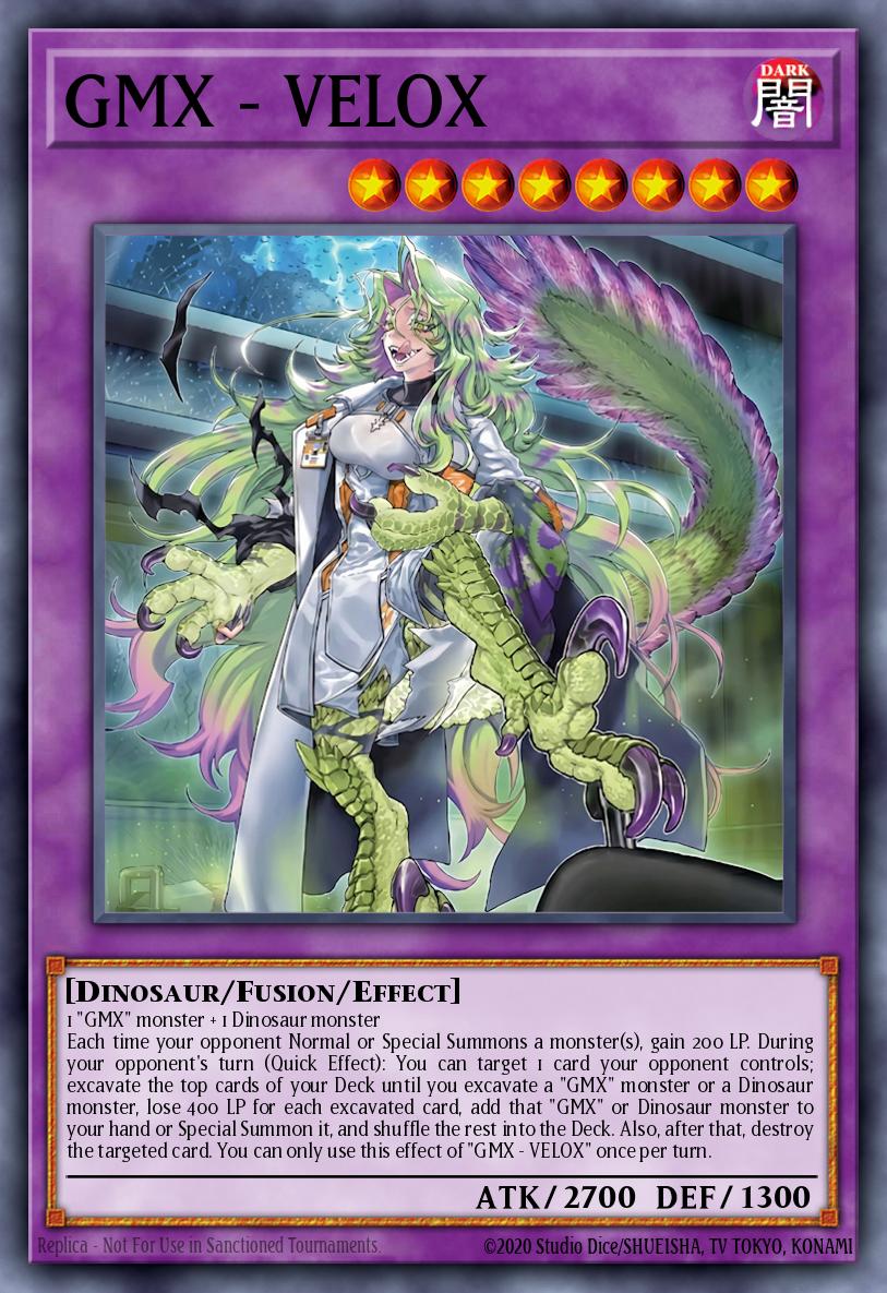 1 "GMX" monster + 1 Dinosaur monster Each time your opponent Normal or Special Summons a monster(s), gain 200 LP. During your opponent's turn (Quick Effect): You can target 1 card your opponent controls; excavate the top cards of your Deck until you excavate a "GMX" monster or a Dinosaur monster, lose 400 LP for each excavated card, add that "GMX" or Dinosaur monster to your hand or Special Summon it, and shuffle the rest into the Deck. Also, after that, destroy the targeted card. You can only use this effect of "GMX - VELOX" once per turn.