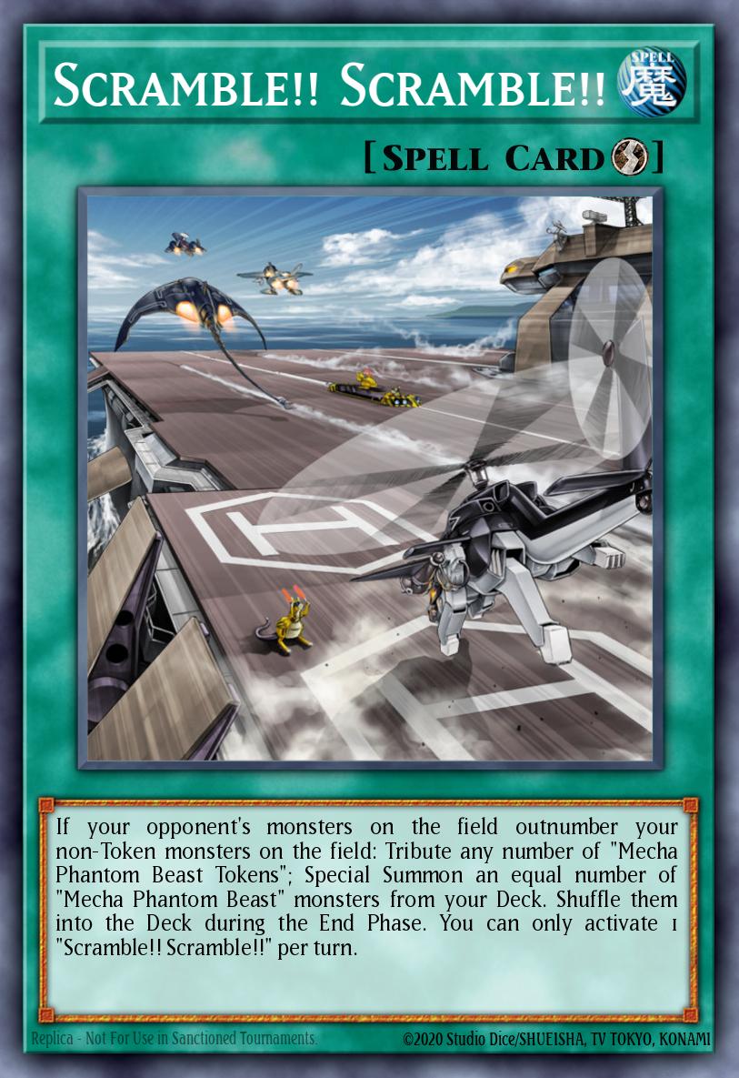 If your opponent's monsters on the field outnumber your non-Token monsters on the field: Tribute any number of "Mecha Phantom Beast Tokens"; Special Summon an equal number of "Mecha Phantom Beast" monsters from your Deck. Shuffle them into the Deck during the End Phase. You can only activate 1 "Scramble!! Scramble!!" per turn.