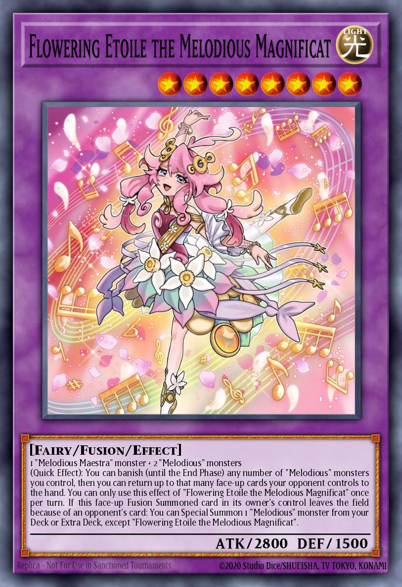 1 "Melodious Maestra" monster + 2 "Melodious" monsters (Quick Effect): You can banish (until the End Phase) any number of "Melodious" monsters you control, then you can return up to that many face-up cards your opponent controls to the hand. You can only use this effect of "Flowering Etoile the Melodious Magnificat" once per turn. If this face-up Fusion Summoned card in its owner's control leaves the field because of an opponent's card: You can Special Summon 1 "Melodious" monster from your Deck or Extra Deck, except "Flowering Etoile the Melodious Magnificat".