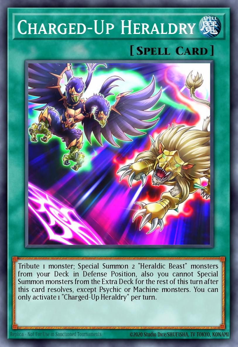 Tribute 1 monster; Special Summon 2 "Heraldic Beast" monsters from your Deck in Defense Position, also you cannot Special Summon monsters from the Extra Deck for the rest of this turn after this card resolves, except Psychic or Machine monsters. You can only activate 1 "Charged-Up Heraldry" per turn.
