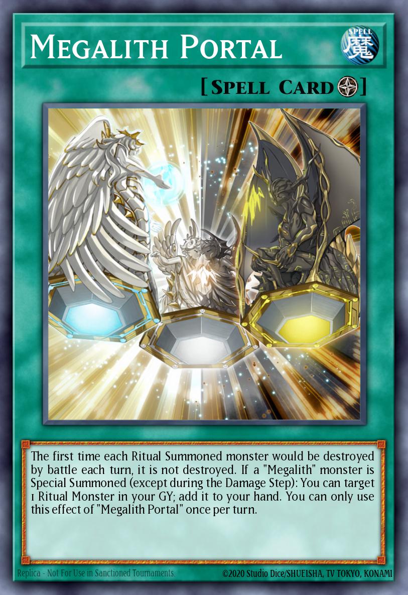 The first time each Ritual Summoned monster would be destroyed by battle each turn, it is not destroyed. If a "Megalith" monster is Special Summoned (except during the Damage Step): You can target 1 Ritual Monster in your GY; add it to your hand. You can only use this effect of "Megalith Portal" once per turn.