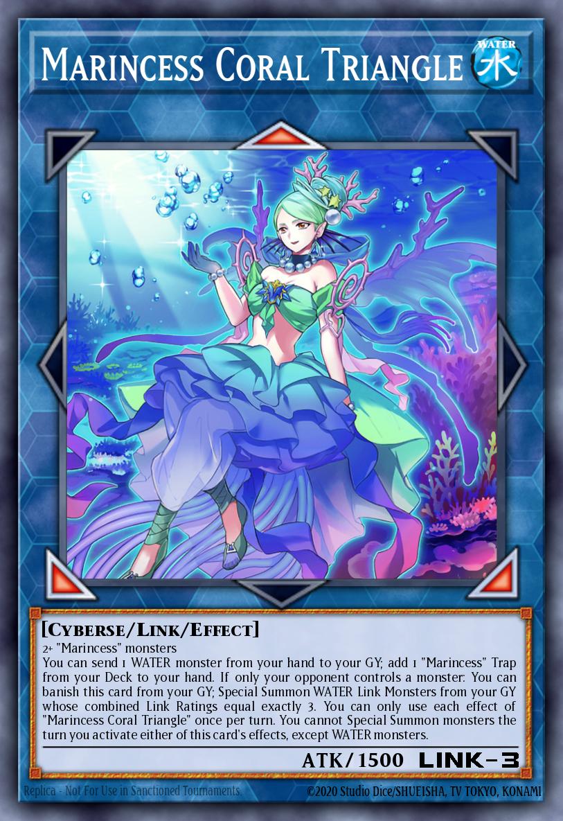 2+ "Marincess" monsters You can send 1 WATER monster from your hand to your GY; add 1 "Marincess" Trap from your Deck to your hand. If only your opponent controls a monster: You can banish this card from your GY; Special Summon WATER Link Monsters from your GY whose combined Link Ratings equal exactly 3. You can only use each effect of "Marincess Coral Triangle" once per turn. You cannot Special Summon monsters the turn you activate either of this card's effects, except WATER monsters.
