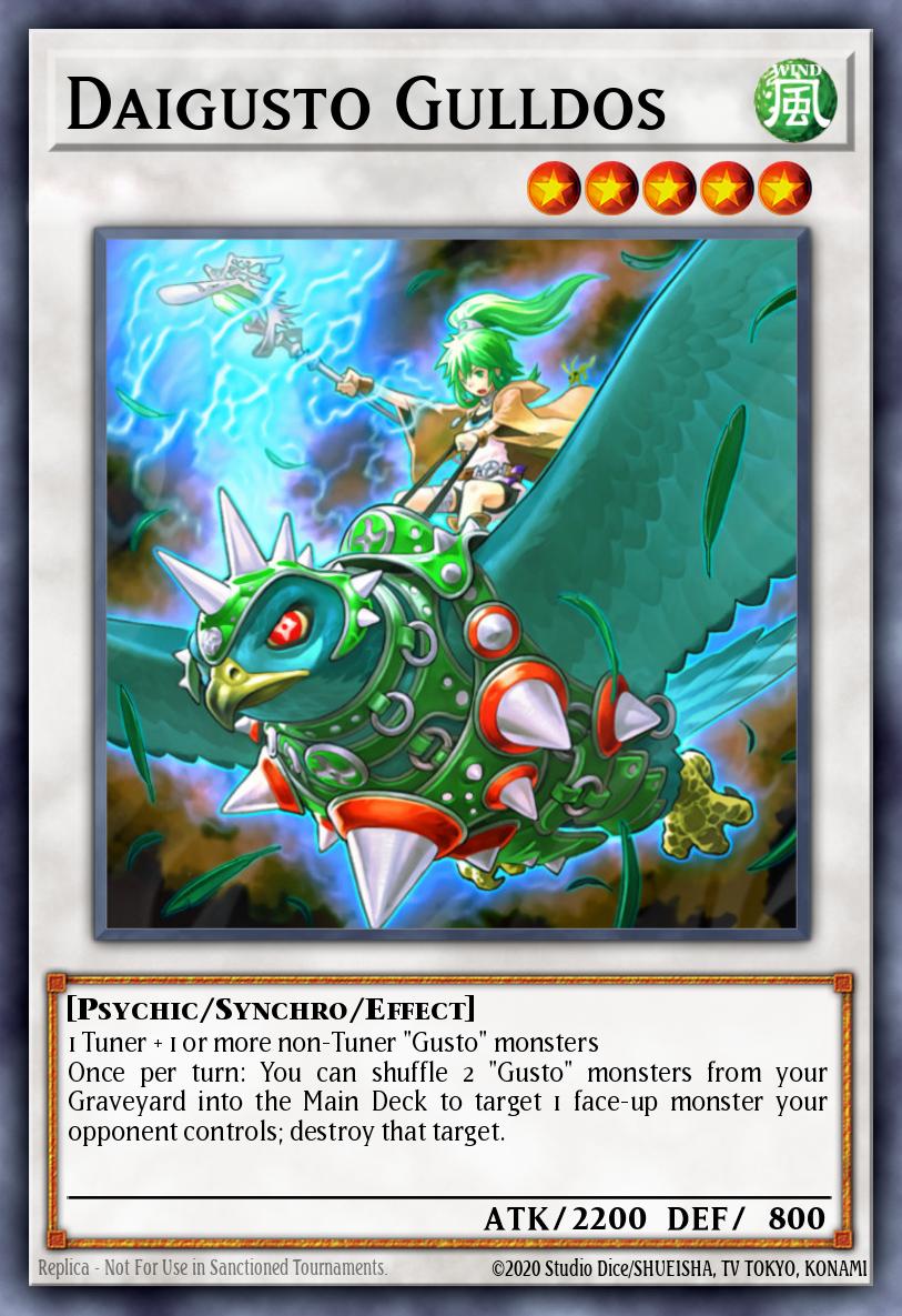 1 Tuner + 1 or more non-Tuner "Gusto" monsters Once per turn: You can shuffle 2 "Gusto" monsters from your Graveyard into the Main Deck to target 1 face-up monster your opponent controls; destroy that target.