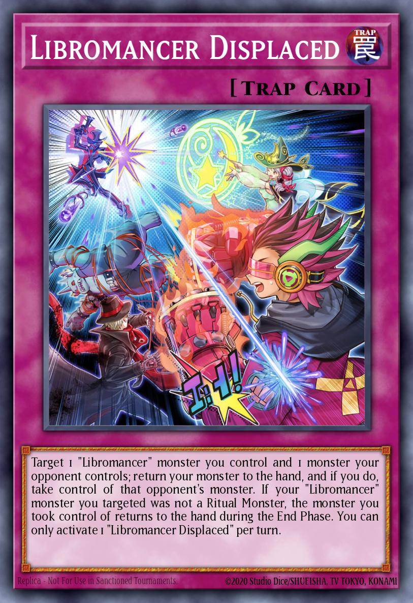 Target 1 "Libromancer" monster you control and 1 monster your opponent controls; return your monster to the hand, and if you do, take control of that opponent's monster. If your "Libromancer" monster you targeted was not a Ritual Monster, the monster you took control of returns to the hand during the End Phase. You can only activate 1 "Libromancer Displaced" per turn.