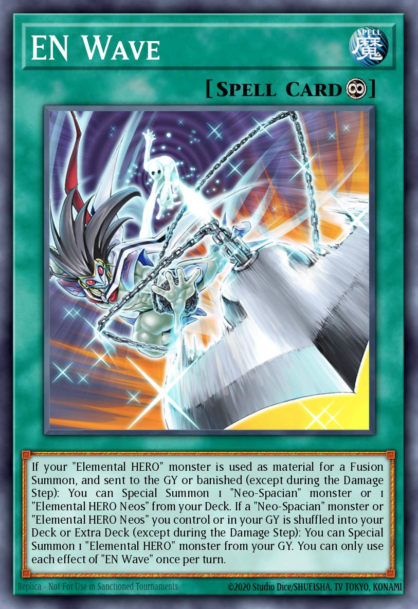 If your "Elemental HERO" monster is used as material for a Fusion Summon, and sent to the GY or banished (except during the Damage Step): You can Special Summon 1 "Neo-Spacian" monster or 1 "Elemental HERO Neos" from your Deck. If a "Neo-Spacian" monster or "Elemental HERO Neos" you control or in your GY is shuffled into your Deck or Extra Deck (except during the Damage Step): You can Special Summon 1 "Elemental HERO" monster from your GY. You can only use each effect of "EN Wave" once per turn.