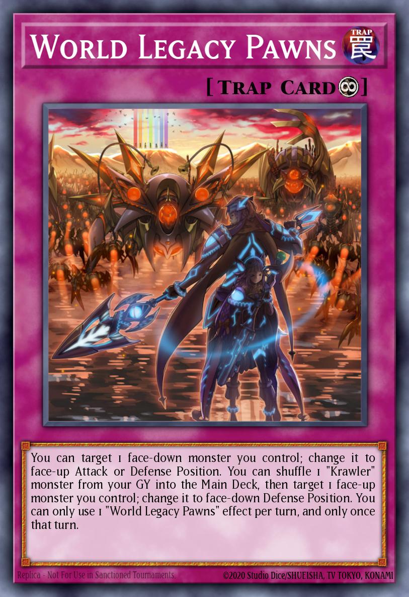 You can target 1 face-down monster you control; change it to face-up Attack or Defense Position. You can shuffle 1 "Krawler" monster from your GY into the Main Deck, then target 1 face-up monster you control; change it to face-down Defense Position. You can only use 1 "World Legacy Pawns" effect per turn, and only once that turn.