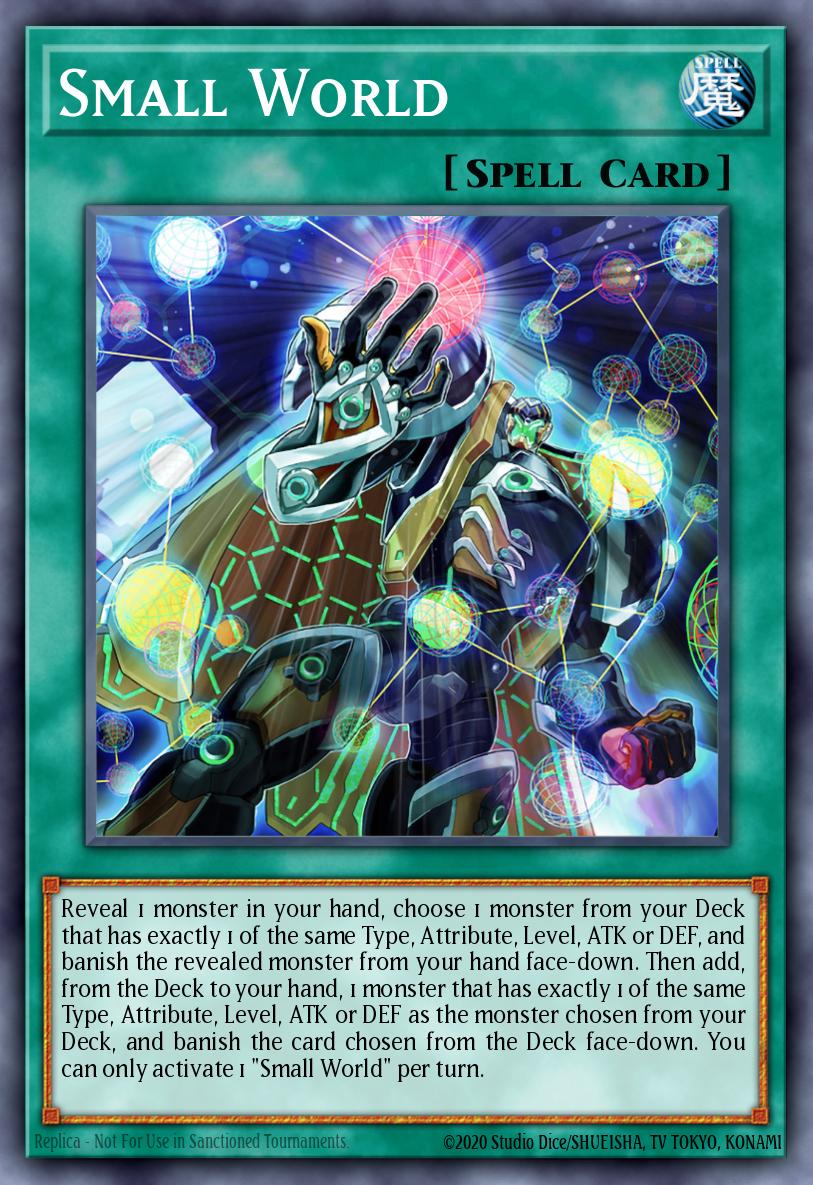 Reveal 1 monster in your hand, choose 1 monster from your Deck that has exactly 1 of the same Type, Attribute, Level, ATK or DEF, and banish the revealed monster from your hand face-down. Then add, from the Deck to your hand, 1 monster that has exactly 1 of the same Type, Attribute, Level, ATK or DEF as the monster chosen from your Deck, and banish the card chosen from the Deck face-down. You can only activate 1 "Small World" per turn.
