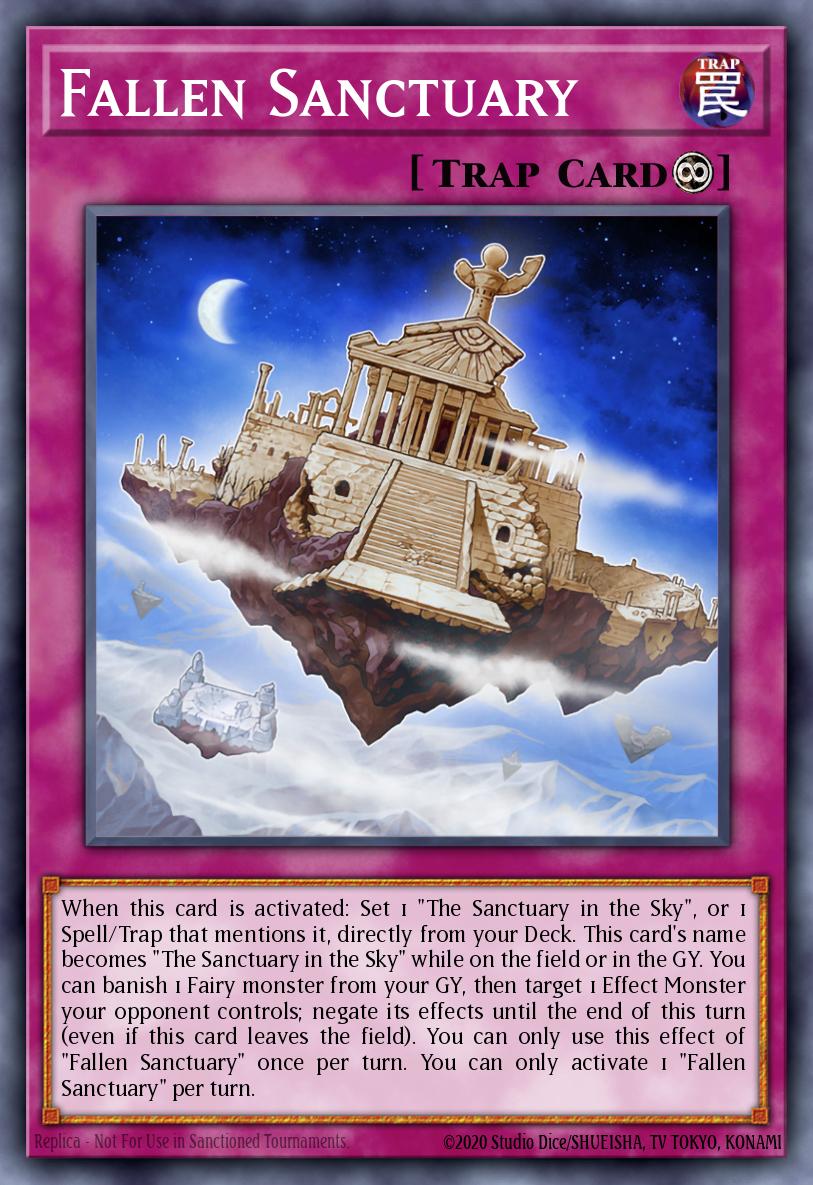 When this card is activated: Set 1 "The Sanctuary in the Sky", or 1 Spell/Trap that mentions it, directly from your Deck. This card's name becomes "The Sanctuary in the Sky" while on the field or in the GY. You can banish 1 Fairy monster from your GY, then target 1 Effect Monster your opponent controls; negate its effects until the end of this turn (even if this card leaves the field). You can only use this effect of "Fallen Sanctuary" once per turn. You can only activate 1 "Fallen Sanctuary" per turn.