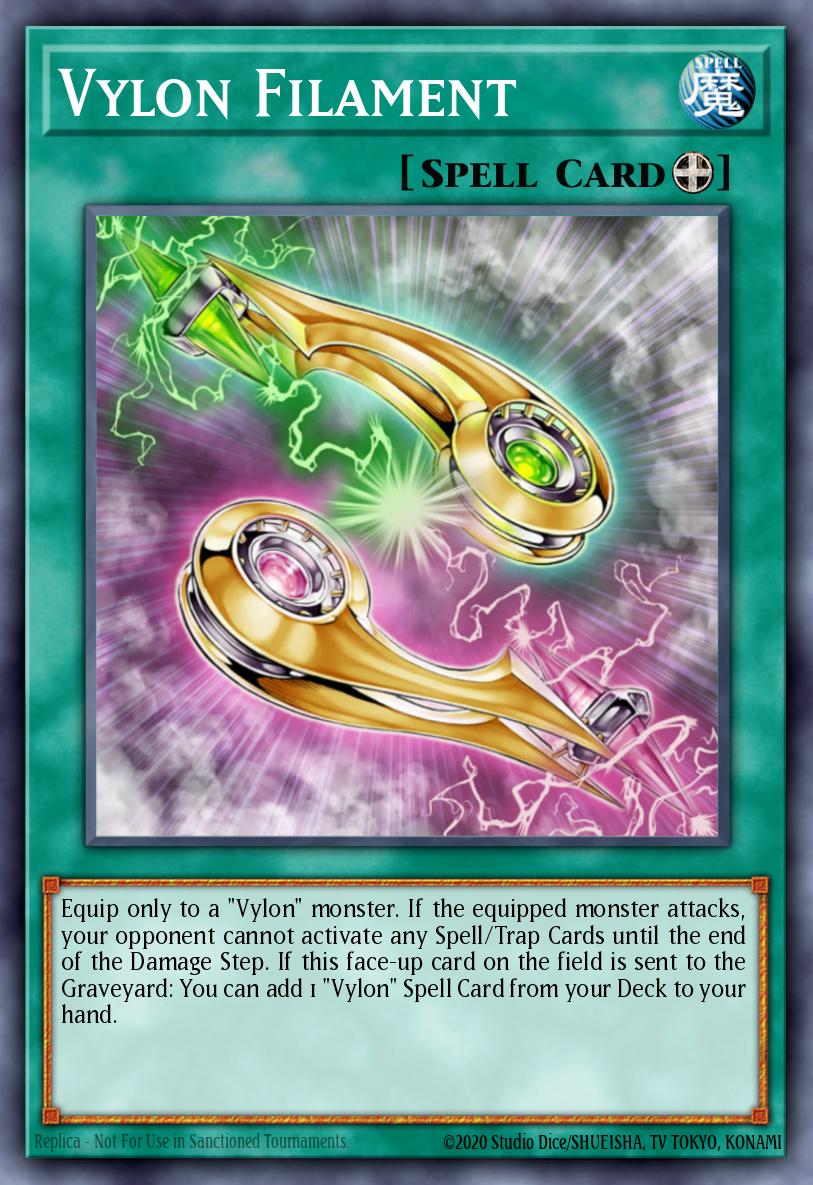 Equip only to a "Vylon" monster. If the equipped monster attacks, your opponent cannot activate any Spell/Trap Cards until the end of the Damage Step. If this face-up card on the field is sent to the Graveyard: You can add 1 "Vylon" Spell Card from your Deck to your hand.