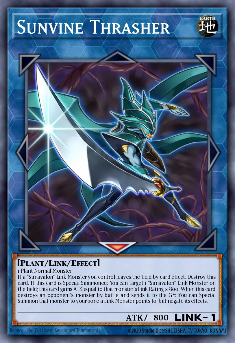 1 Plant Normal Monster If a "Sunavalon" Link Monster you control leaves the field by card effect: Destroy this card. If this card is Special Summoned: You can target 1 "Sunavalon" Link Monster on the field; this card gains ATK equal to that monster's Link Rating x 800. When this card destroys an opponent's monster by battle and sends it to the GY: You can Special Summon that monster to your zone a Link Monster points to, but negate its effects.