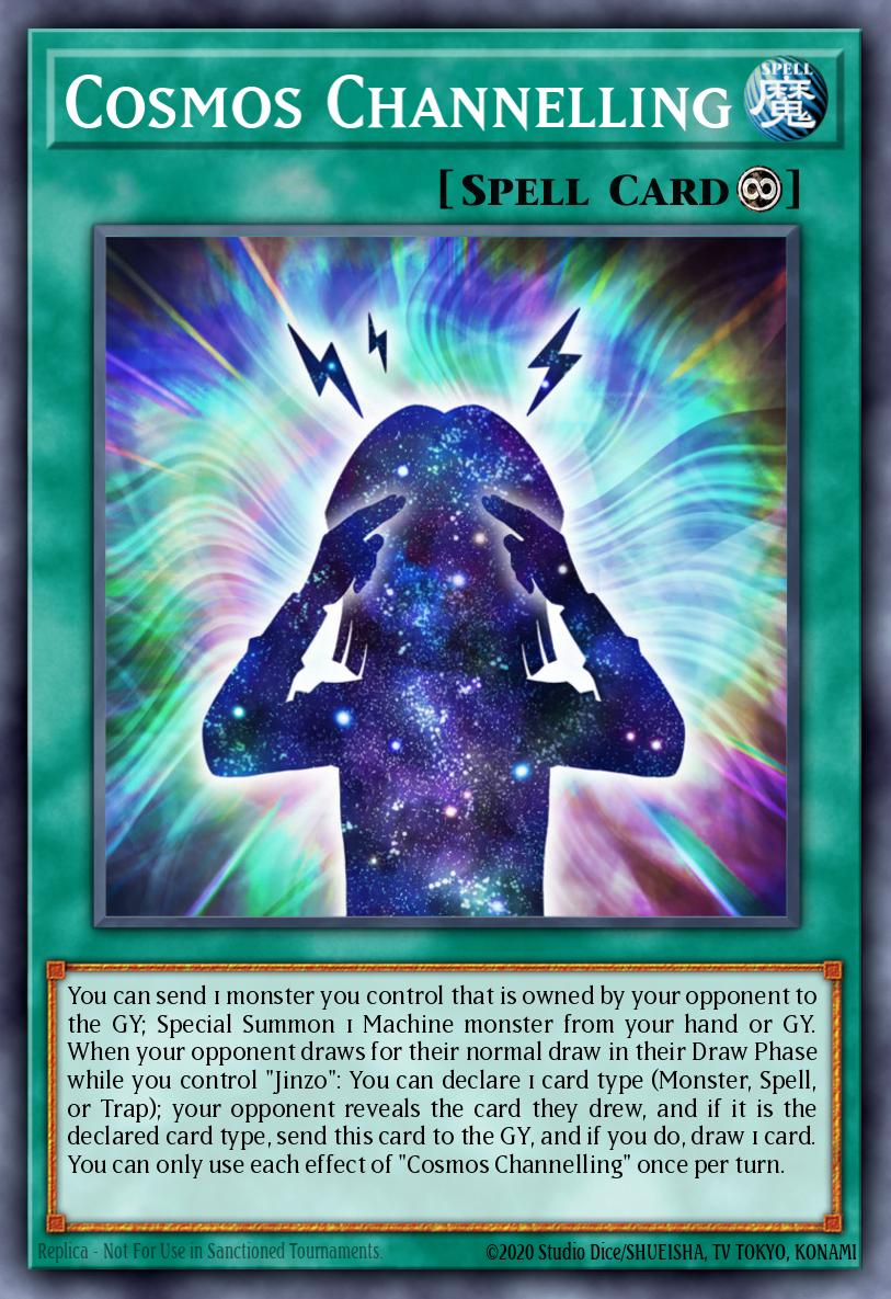 You can send 1 monster you control that is owned by your opponent to the GY; Special Summon 1 Machine monster from your hand or GY. When your opponent draws for their normal draw in their Draw Phase while you control "Jinzo": You can declare 1 card type (Monster, Spell, or Trap); your opponent reveals the card they drew, and if it is the declared card type, send this card to the GY, and if you do, draw 1 card. You can only use each effect of "Cosmos Channelling" once per turn.