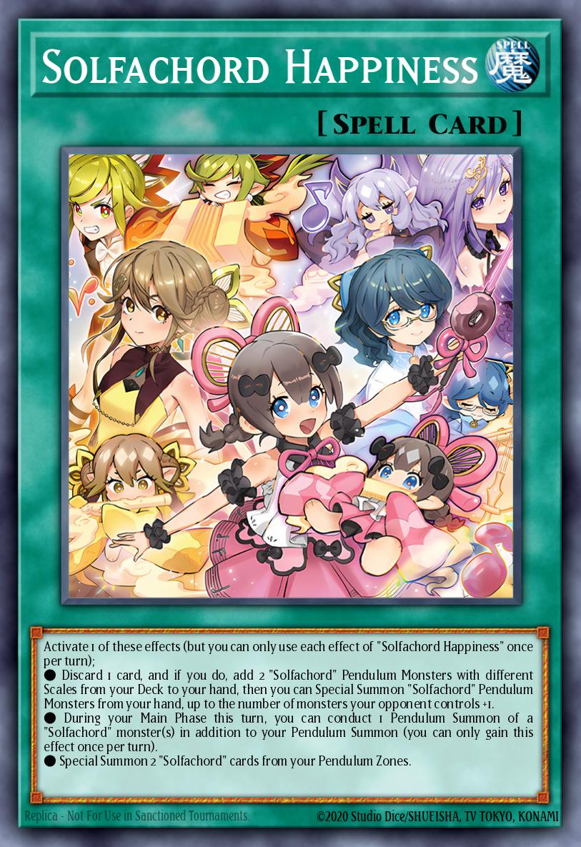 Activate 1 of these effects (but you can only use each effect of "Solfachord Happiness" once per turn); ● Discard 1 card, and if you do, add 2 "Solfachord" Pendulum Monsters with different Scales from your Deck to your hand, then you can Special Summon "Solfachord" Pendulum Monsters from your hand, up to the number of monsters your opponent controls +1. ● During your Main Phase this turn, you can conduct 1 Pendulum Summon of a "Solfachord" monster(s) in addition to your Pendulum Summon (you can only gain this effect once per turn). ● Special Summon 2 "Solfachord" cards from your Pendulum Zones.