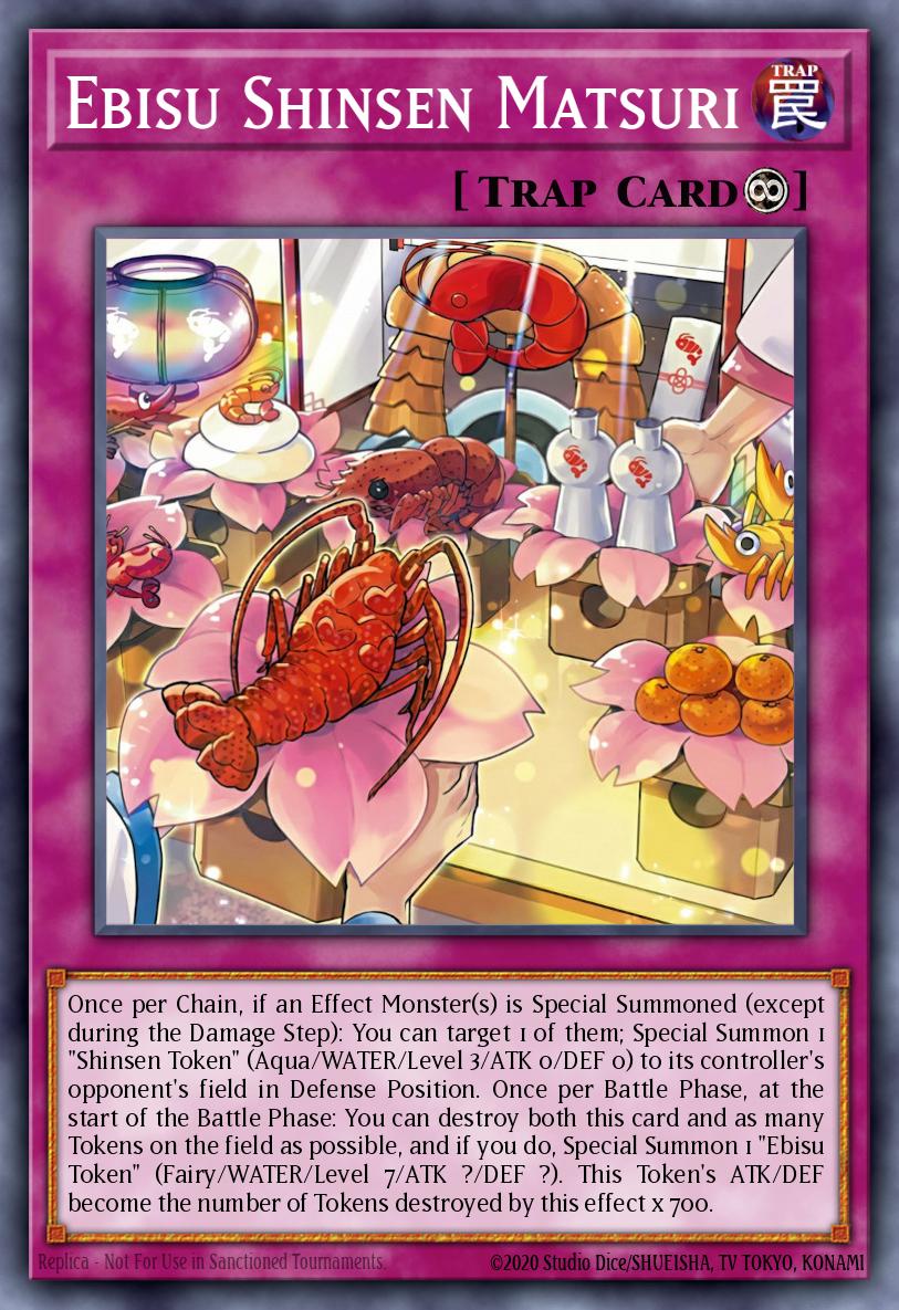 Once per Chain, if an Effect Monster(s) is Special Summoned (except during the Damage Step): You can target 1 of them; Special Summon 1 "Shinsen Token" (Aqua/WATER/Level 3/ATK 0/DEF 0) to its controller's opponent's field in Defense Position. Once per Battle Phase, at the start of the Battle Phase: You can destroy both this card and as many Tokens on the field as possible, and if you do, Special Summon 1 "Ebisu Token" (Fairy/WATER/Level 7/ATK ?/DEF ?). This Token's ATK/DEF become the number of Tokens destroyed by this effect x 700.