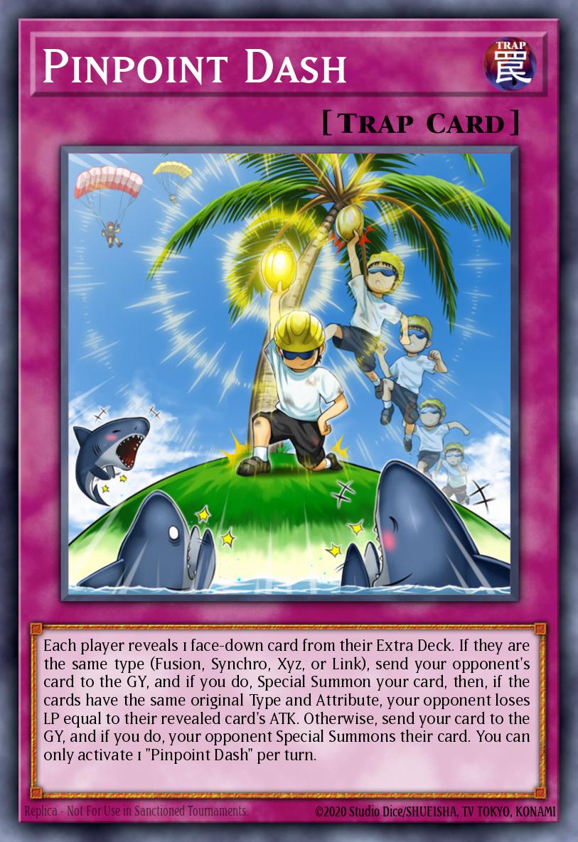 Each player reveals 1 face-down card from their Extra Deck. If they are the same type (Fusion, Synchro, Xyz, or Link), send your opponent's card to the GY, and if you do, Special Summon your card, then, if the cards have the same original Type and Attribute, your opponent loses LP equal to their revealed card's ATK. Otherwise, send your card to the GY, and if you do, your opponent Special Summons their card. You can only activate 1 "Pinpoint Dash" per turn.