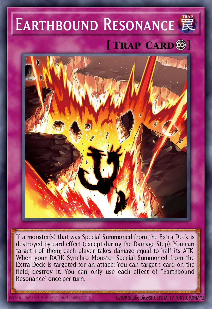 If a monster(s) that was Special Summoned from the Extra Deck is destroyed by card effect (except during the Damage Step): You can target 1 of them; each player takes damage equal to half its ATK. When your DARK Synchro Monster Special Summoned from the Extra Deck is targeted for an attack: You can target 1 card on the field; destroy it. You can only use each effect of "Earthbound Resonance" once per turn.