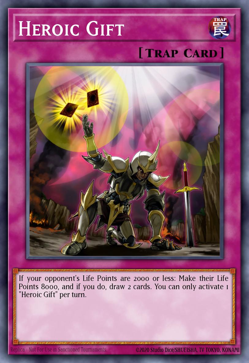 If your opponent's Life Points are 2000 or less: Make their Life Points 8000, and if you do, draw 2 cards. You can only activate 1 "Heroic Gift" per turn.