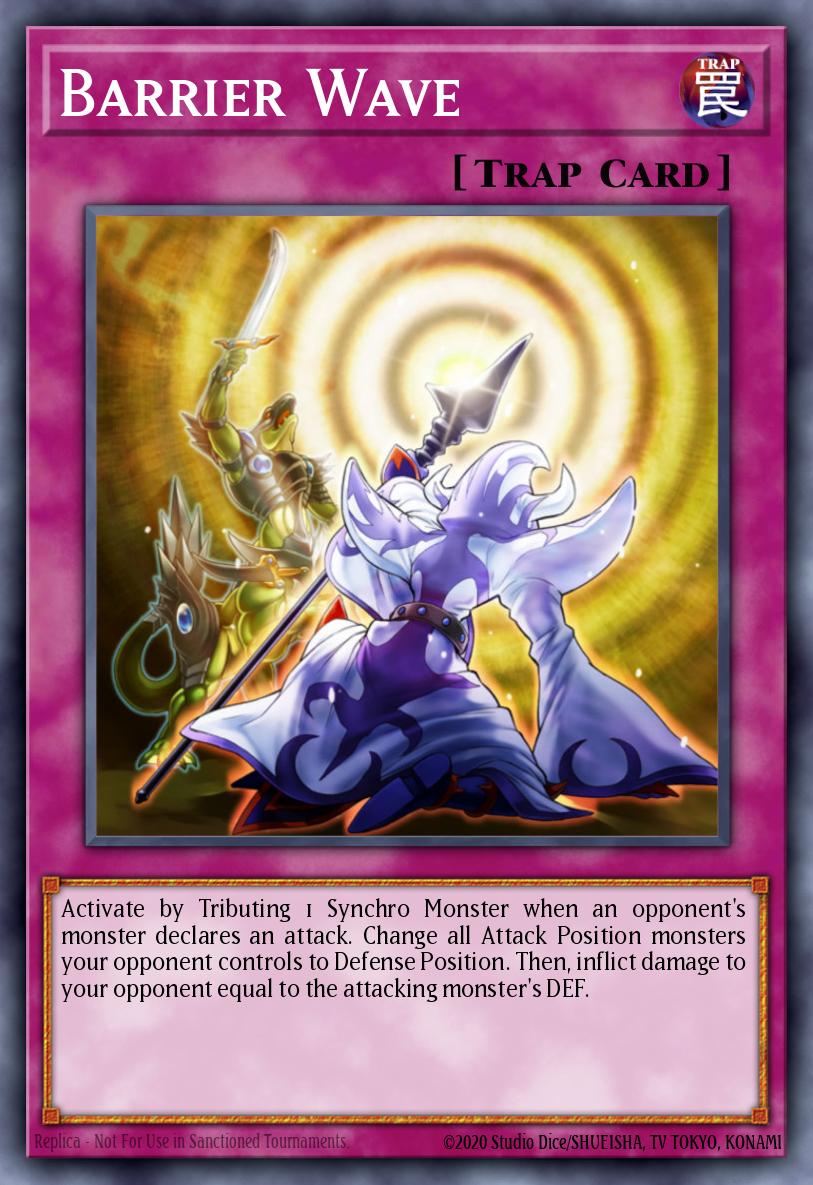 Activate by Tributing 1 Synchro Monster when an opponent's monster declares an attack. Change all Attack Position monsters your opponent controls to Defense Position. Then, inflict damage to your opponent equal to the attacking monster's DEF.