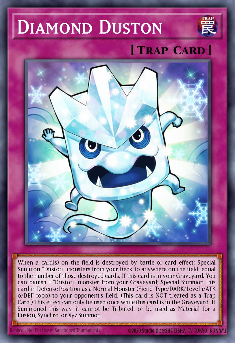 When a card(s) on the field is destroyed by battle or card effect: Special Summon "Duston" monsters from your Deck to anywhere on the field, equal to the number of those destroyed cards. If this card is in your Graveyard: You can banish 1 "Duston" monster from your Graveyard; Special Summon this card in Defense Position as a Normal Monster (Fiend-Type/DARK/Level 1/ATK 0/DEF 1000) to your opponent's field. (This card is NOT treated as a Trap Card.) This effect can only be used once while this card is in the Graveyard. If Summoned this way, it cannot be Tributed, or be used as Material for a Fusion, Synchro, or Xyz Summon.