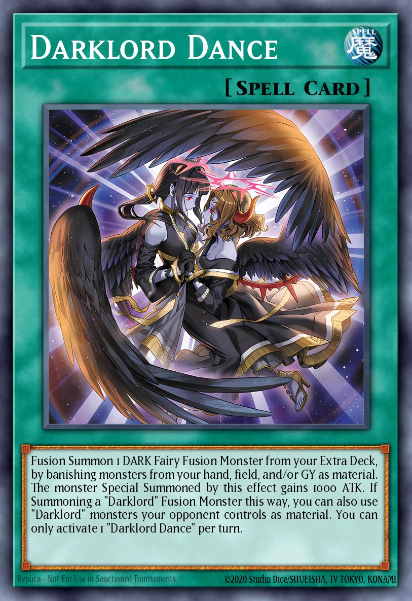 Fusion Summon 1 DARK Fairy Fusion Monster from your Extra Deck, by banishing monsters from your hand, field, and/or GY as material. The monster Special Summoned by this effect gains 1000 ATK. If Summoning a "Darklord" Fusion Monster this way, you can also use "Darklord" monsters your opponent controls as material. You can only activate 1 "Darklord Dance" per turn.